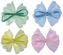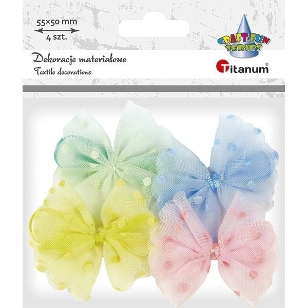Aplikacje materiałowe kokardki 55x50mm tiulowe w groszki z satynową wstążką 3mm błękitne, jasnozielone, jasnoróżowe, żółte 4szt. číst celé