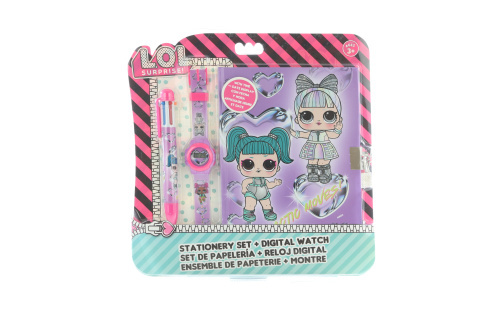 Sada obsahuje zápisník, 6ti barevnou propisku a digitální hodinky (napájení na 1 baterii AG3, součástí balení). Rozměr balení cca 26 x 26 x 2 cm. Věk 3+ číst celé