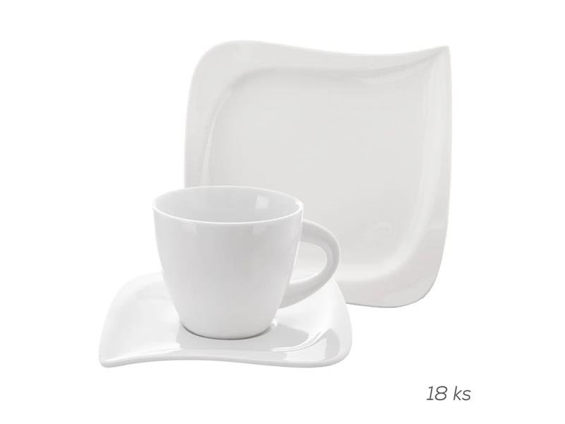 Kávová porcelánová sada obsahuje 18 dílů – 6x talíř dezertní, 6x podšálek a 6x šálek. Hranatý tvar talířů. Technické parametry:- Materiál: porcelán- Rozměry: dezertní 21,5x21,5 cm, podšálek 13,6x16,3, šálek o. 215 ml, pr. 8 cm, v. 7 cm- Můžete mýt v myčce, lze použít v mikrovlnné troubě číst celé