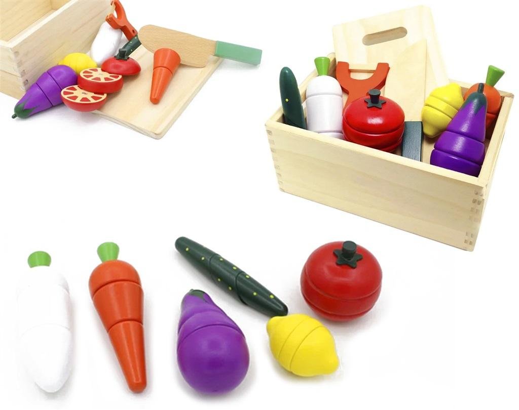 Drewniane, łączone magnesem warzywa do krojenia zapakowane w skrzynkę. číst celé