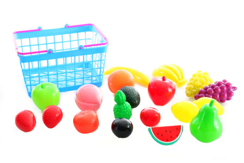 Plastový košík s ovocem. Rozměry košíku cca 23,5 x 17 x 14 cm. Baleno v průhledném igelitu. Celkem 20 ks. Věk 3+ číst celé