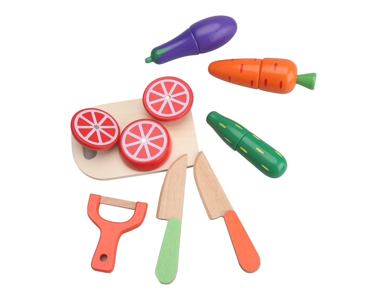 Krájecí dřeěné potraviny. Rozkroj mrkev nebo rajče. Hra pomáhá rozvoji dětské motoriky. číst celé