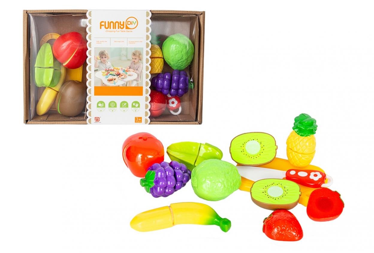 Zestaw zawiera deskę do krojenia, nóż, warzywa i owoce w dwóch częsciach łączonych rzepem. číst celé