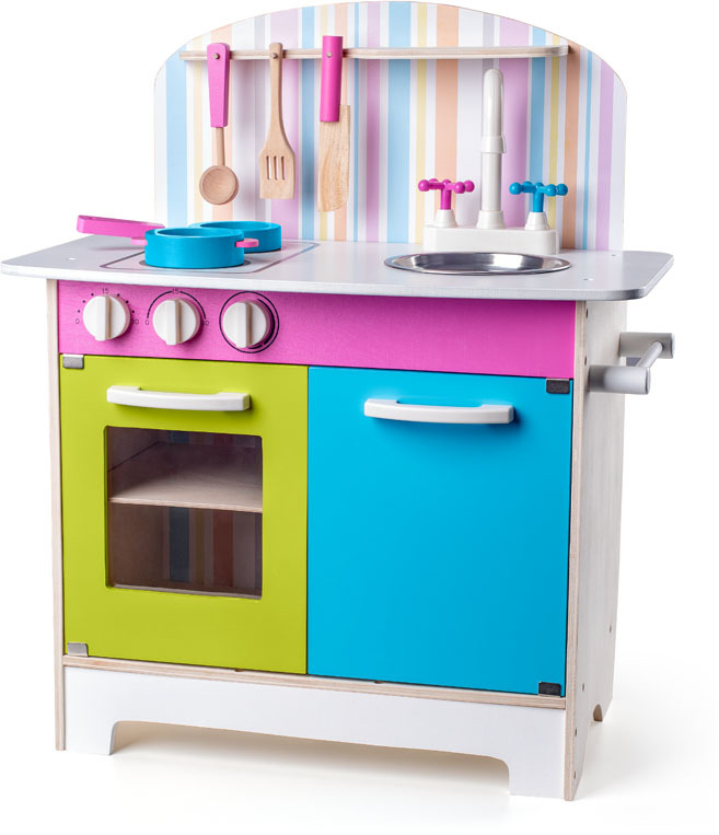 Věk dítěte 3 roky, výška 68,5 cm, šířka 58 cm, délka 31 cm, materiál kuchyňky dřevěná Kuchyňka s příslušenstvím v atraktivním designu s proužky je plně vybavena kuchyňským nádobím a náčiním. Má otočné knoflíky, které vydávají zvuk jako u skutečných spotřebičů. číst celé