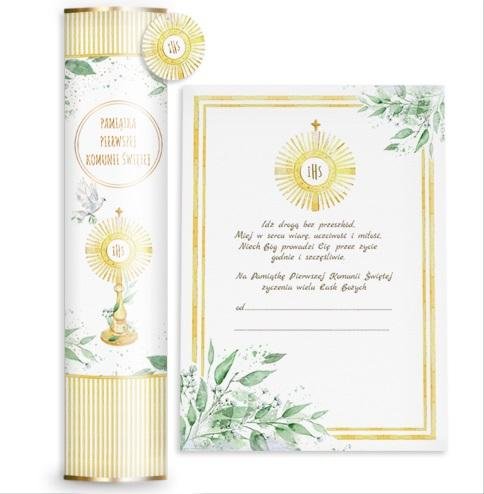 Tuba Komunijna, wysokość 25cm,średnica 5 cm. Bogato złocona, zamykana stalowymi złotymi wieczkami. W komplecie kartka z życzeniami A4 z obwolutą i bilecikiem. Całość zapakowana w worek foliowy z wstążką i przywieszką. číst celé