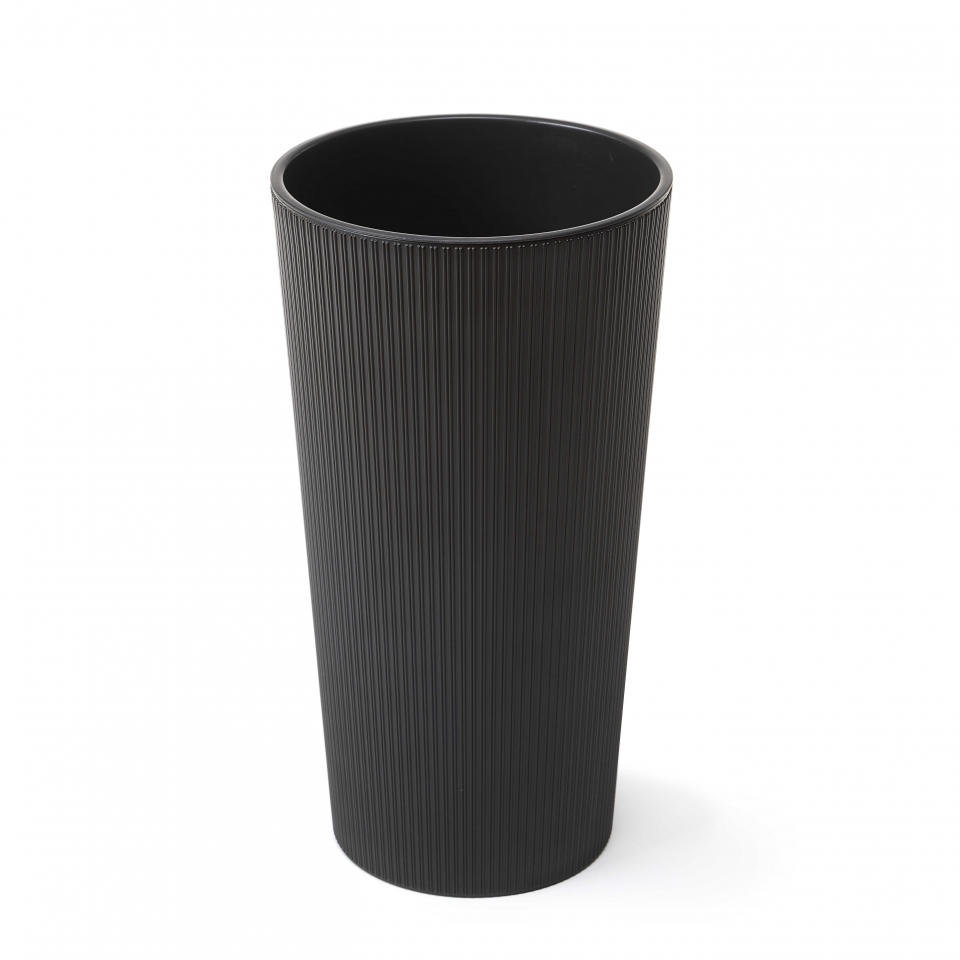 Vysoký plastový květináč z vnější strany zdobený proužkem a matným povrchem, kónického tvaru a s vyjímatelnou černou plastovou vložkou. Do plastové vložky můžete rostliny přímo sadit, pokud do dna této vložky vyvtráte odtokové otvory. Barva: černá Rozměr: výška 36,4 cm průměr v horní části 19 cm číst celé