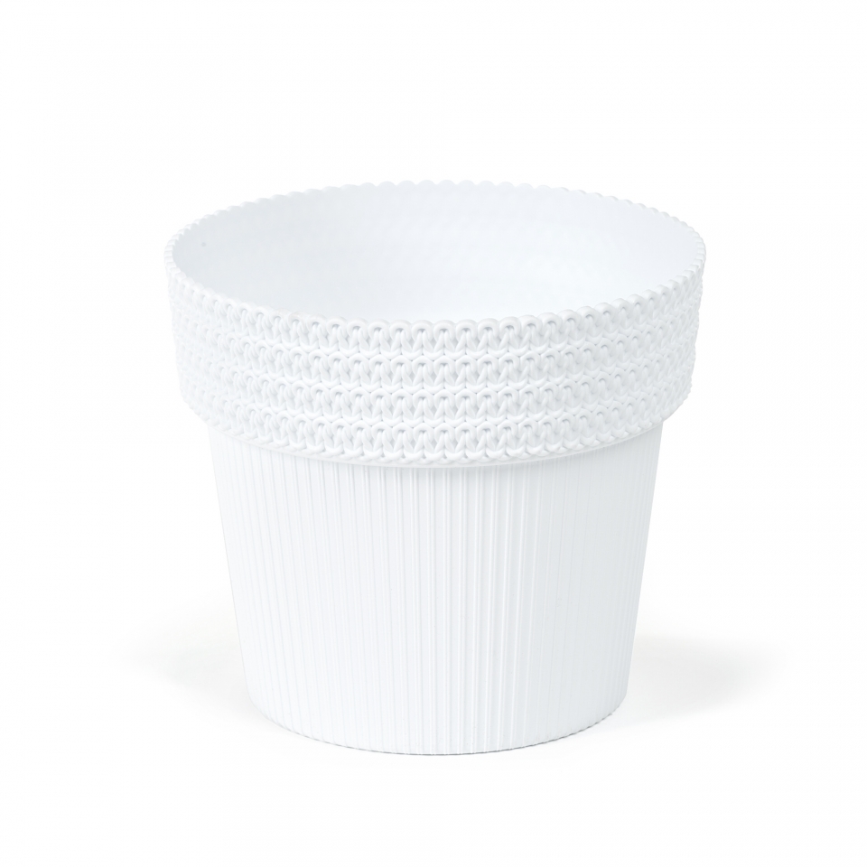 Plastový květináč Pola Jumper z vnější strany zdobený proužkem a pleteným okrajem. Květináče jsou vhodné do interiérů i ven. Barva: bílá Rozměr: výška 17,5 cm průměr 20 cm číst celé