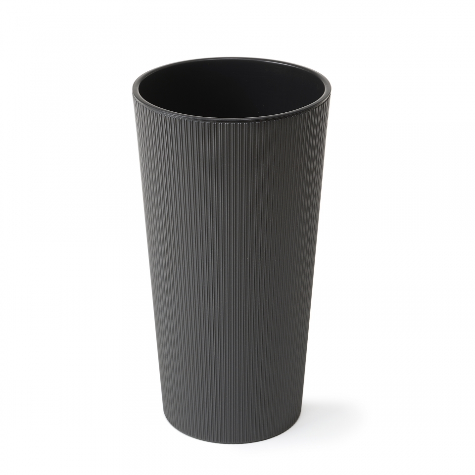 Vysoký plastový květináč z vnější strany zdobený proužkem a matným povrchem, kónického tvaru a s vyjímatelnou černou plastovou vložkou. Do plastové vložky můžete rostliny přímo sadit, pokud do dna této vložky vyvtráte odtokové otvory. Barva: grafitová Rozměr: výška 57 cm průměr v horní části 30 cm číst celé