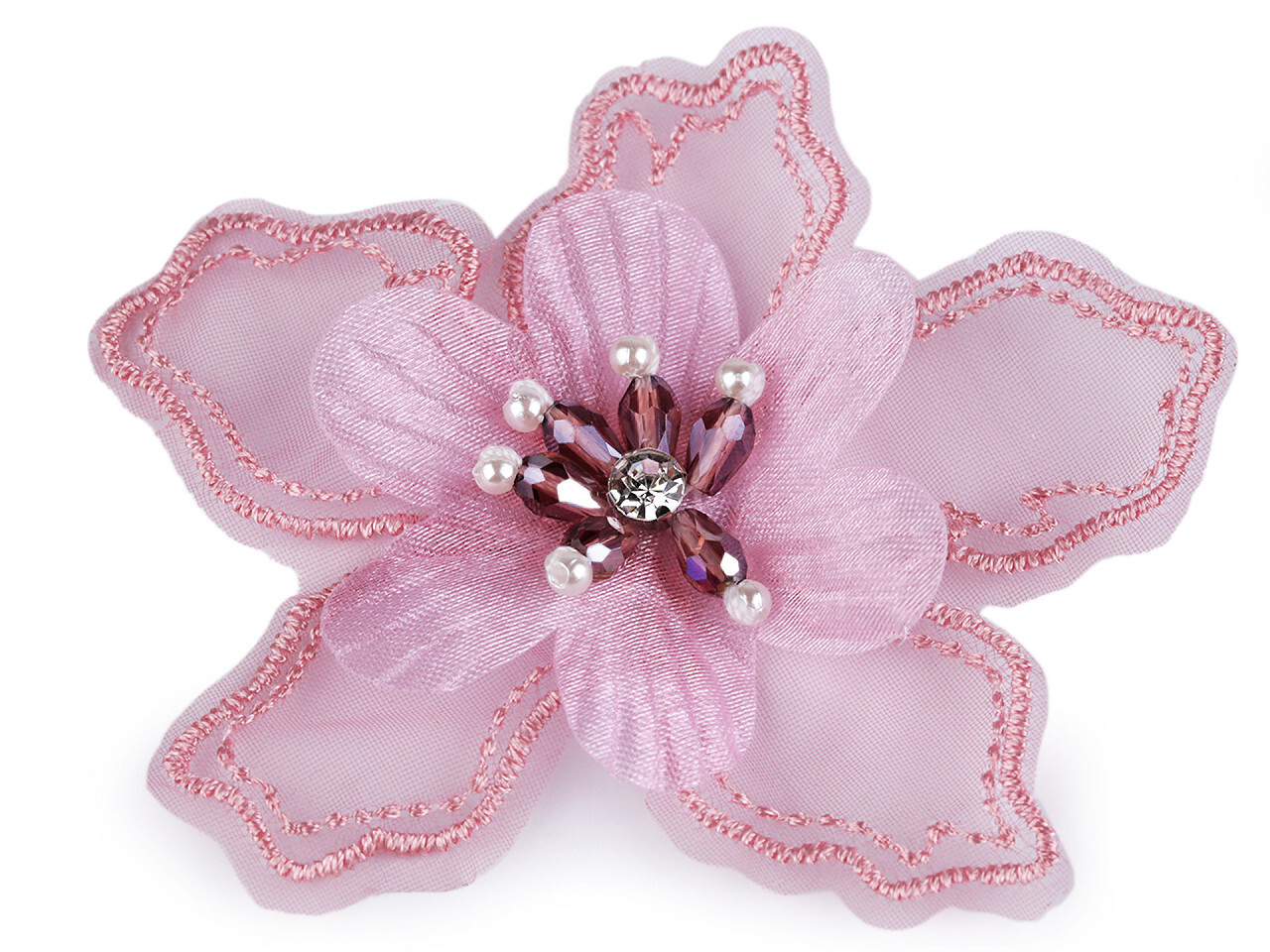 Zdobný květ je složený ze 2 vrstev: spodní část květu je monofilová se zesílenými vyšívanými okraji a působí velmi romanticky. Druhou vrstvu tvoří jednoduchý květ z organzy. Střed květu zdobí našité broušené korálky, perličky a broušený kamínek.Použití: Květ můžete našít či nalepit na svetříky,...