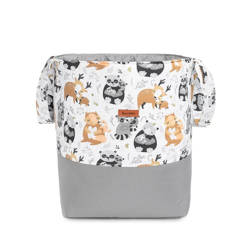 Koš na hračky Sensillo nabízí kvůli čtvercové základně více místa než běžné koše. Je vyztužen silikonovou netkanou textilií, která mu zajišťuje pevný tvar i při naplnění hračkami. Silné a vyztužené rukojeti usnadňují přenášení koše kamkoliv budete potřebovat. Robustní polyesterový materiál, použitý na spodní část a vnitřek koše, je odolný vůči oděru, zatímco vrchní část z bavlny dodává koši příjemný a jedinečný vzhled.