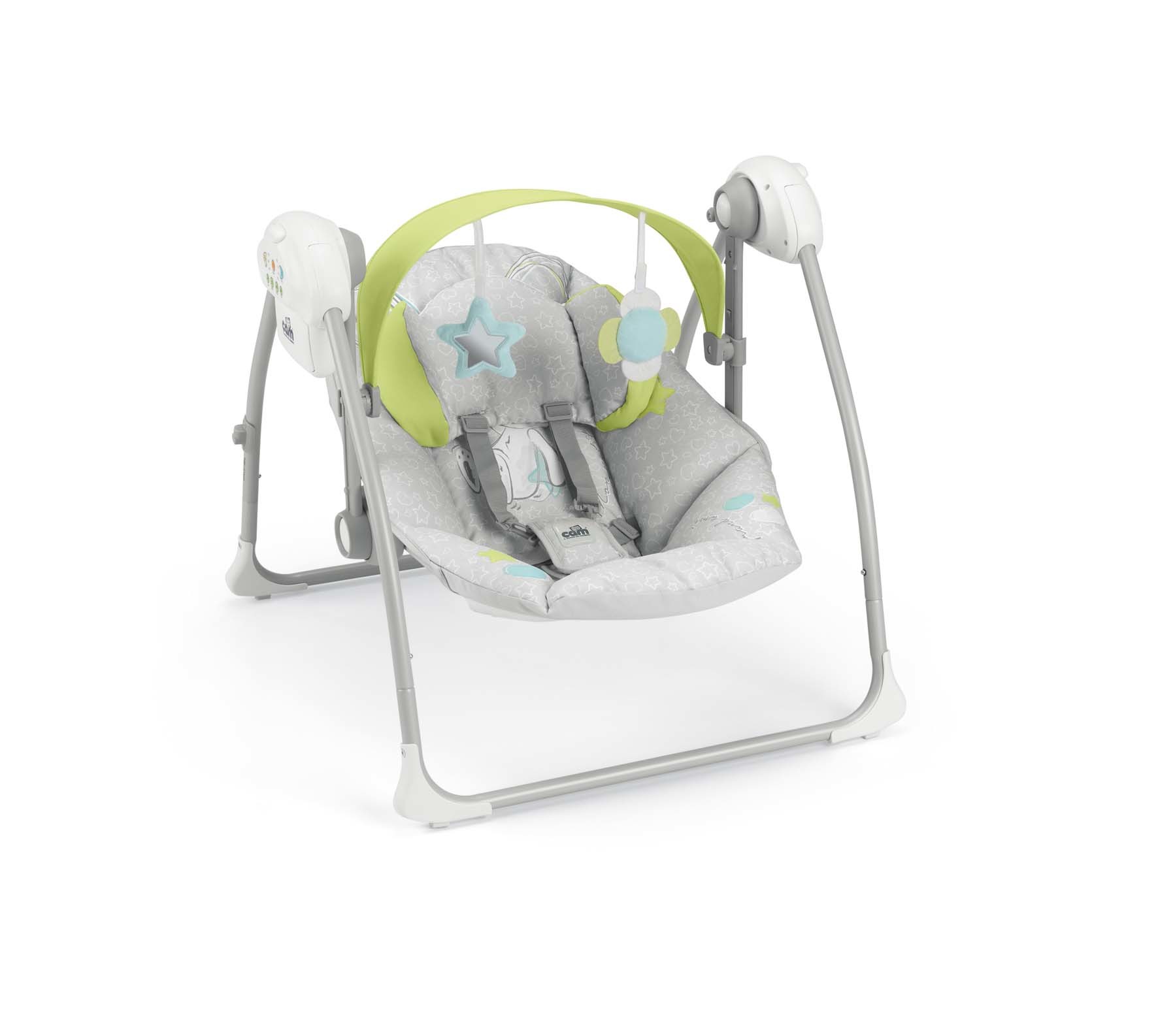 Nastavitelné opěradlo do 2 poloh vhodná od narození do 9kgměkký látkový potah a opěrka hlavy 5 ti bodový bezpečnostní pás sluneční stříška s nastavitelnou výškou a s dvěmi plyšovými hračkami nastavitelná výška 3 nastavitelné rychlosti automatické nastavení času vypnutí (po... číst celé