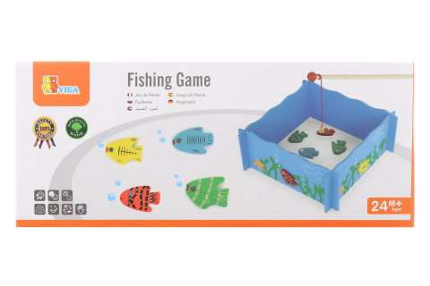 Dřevěné rybaření na magnet. Balení obsahuje rybářký bazének, 4 magnetické pruty a 20 rybiček a čísly. Rozměry bazénku cca 35 x 13 x 5 cm. Rozměry balení cca 37 x 16 x 5,5 cm. Věk 24m+ číst celé