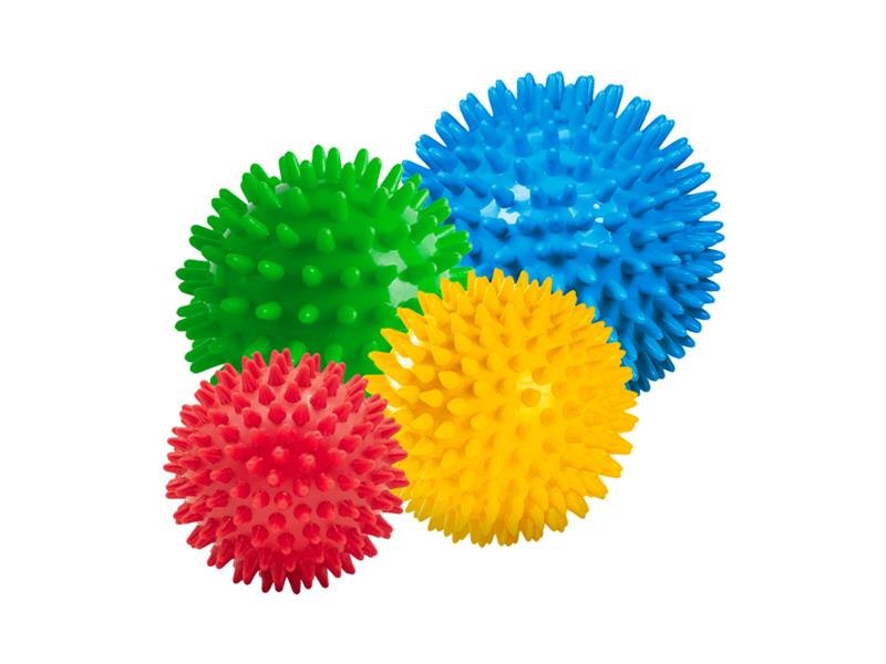 Sada senzorických míčků s masážními hrotyTechnické parametry:Průměr:Červená: 7 cmŽlutá: 8 cmZelená: 9 cmModrá: 10 cmTvrdost: střední4 kusy v sadě číst celé