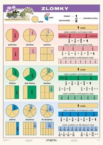 Naučná tabulka usnadňuje žákům osvojit si pojmy celek, část, čitatel, jmenovatel, zlomková čára a pomocí názorných obrázků určovat polovinu, čtvrtinu, třetinu daného celku. Pomáhá i při sčítání zlomků se stejným jmenovatelem v jednoduchých případech.