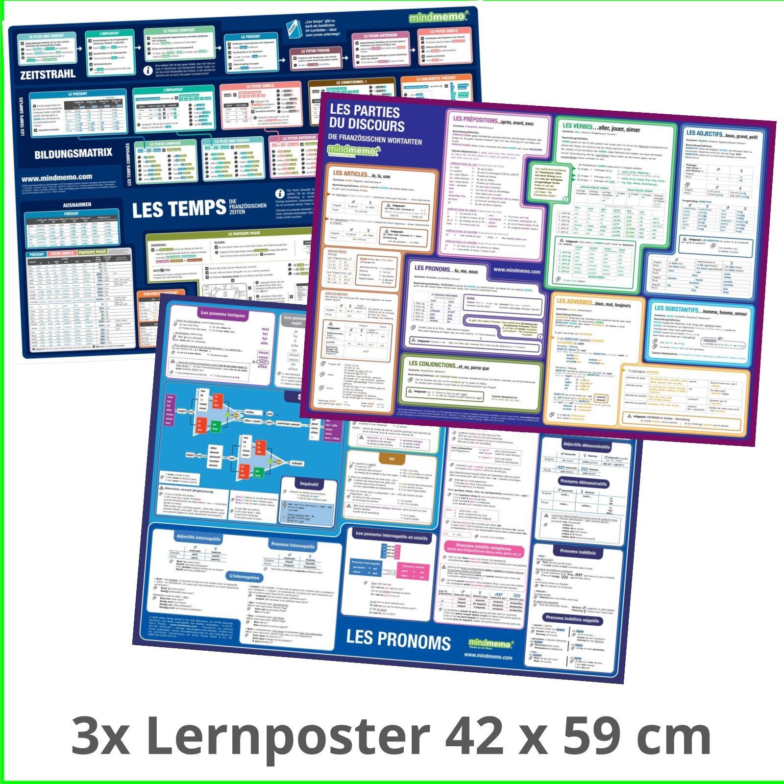 mindmemo Lernposter 3er Set - Französische Zeiten + Wortarten + Pronomen | Grammatik lernen Grundwissen Lernhilfe