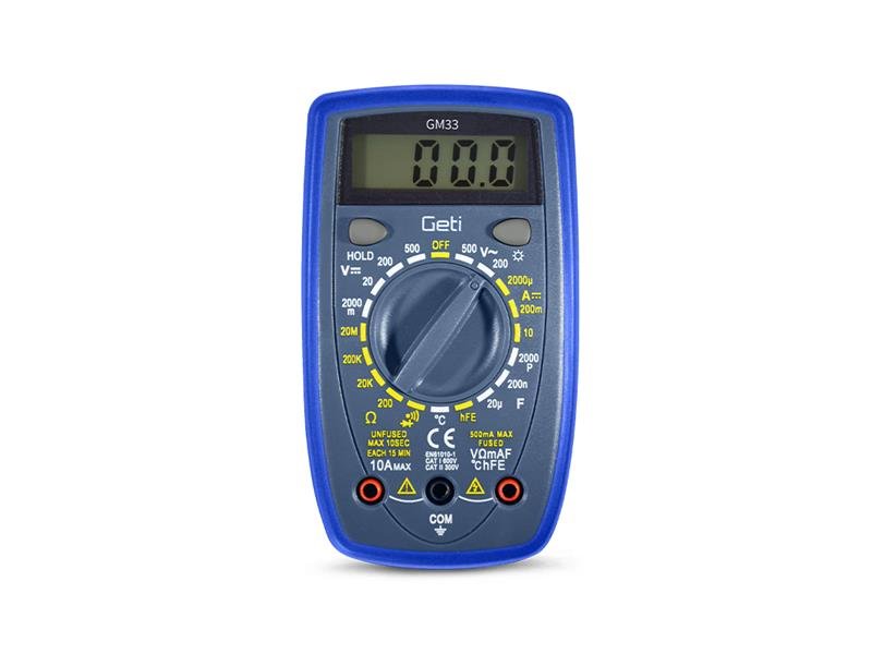 Multimetr GETI GM33A nalezne své uplatnění při měření široké škály elektrických veličin jako jsou například: napětí (DCV a ACV), proud (DCA), odpor, kapacita a mnoho dalších. Přehledný displej doplněný o podsvícení, zajišťuje snadnou a přesnou čitelnost naměřených hodnot i za horších světelných podmínek. Přístroj je také vybaven dalšími praktickými funkcemi, jako je indikace slabé baterie, ochrana proti přetížení, testování diod, měření kontinuity nebo testování tranzistorů, které dodávají multimetru uživatelsky přívětivý charakter, který díky kompaktním rozměrům a nízké hmotnosti zaručuje snadnou manipulaci i v těžko přístupných místech. Všechny tyto vlastnosti z tohoto přístroje činí všestranného pomocníka, nejen v dílnách, ale i domácnostech.