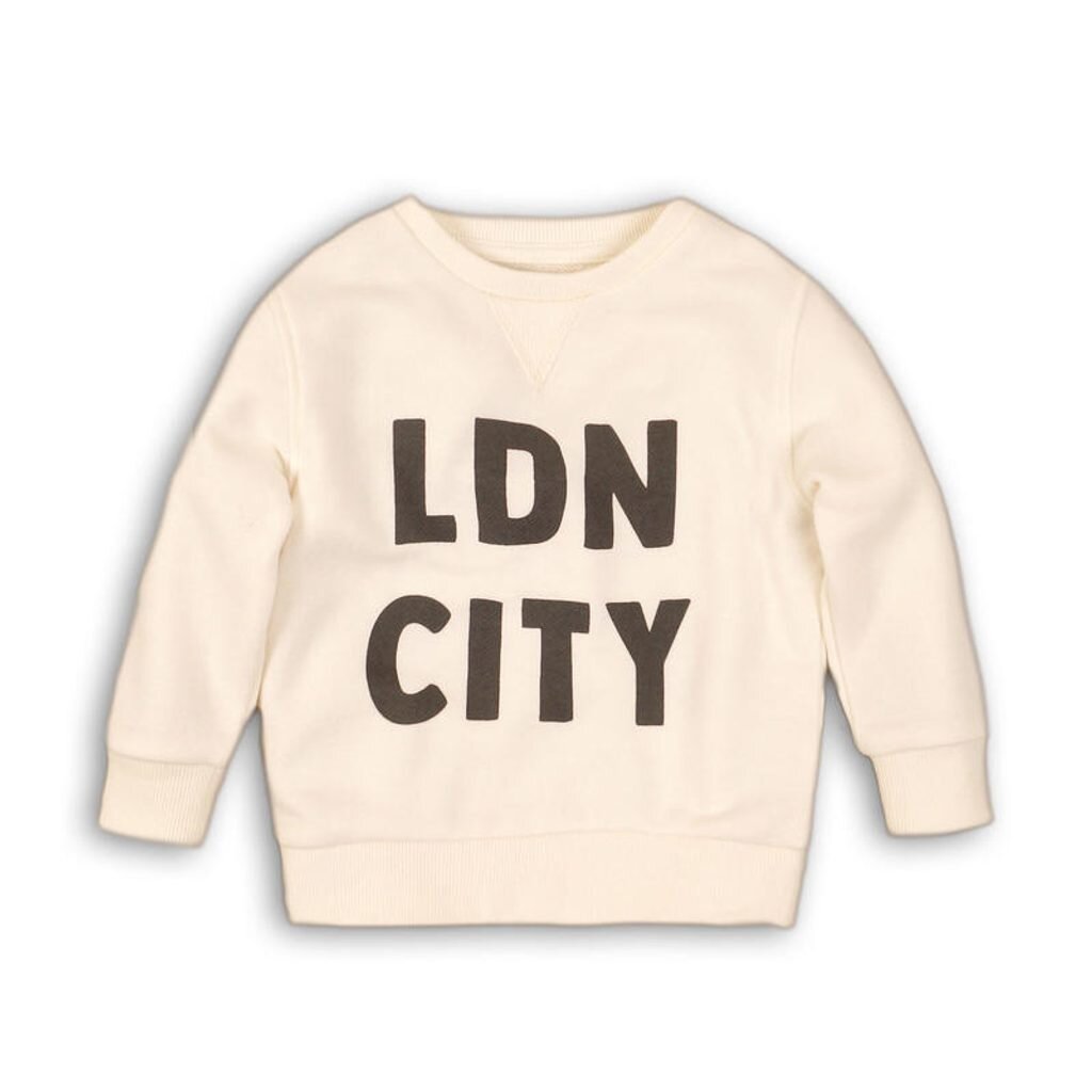 Bílá chlapecká mikina s nápisem na přední straně. číst celé