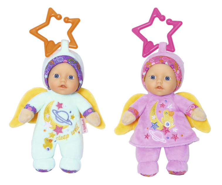Jako strážný anděl…Rozkošné 18 cm panenky se starostlivě dívají, co všechno se děje v životě miminka. Můžou být připnuty k přenosné sedačce nebo postýlce použitím hvězdičky nebo měsíčku připevněného k čepičce. Hadrová panenka nosí plyšový obleček v mentolové nebo růžové barvě a její vinylová...