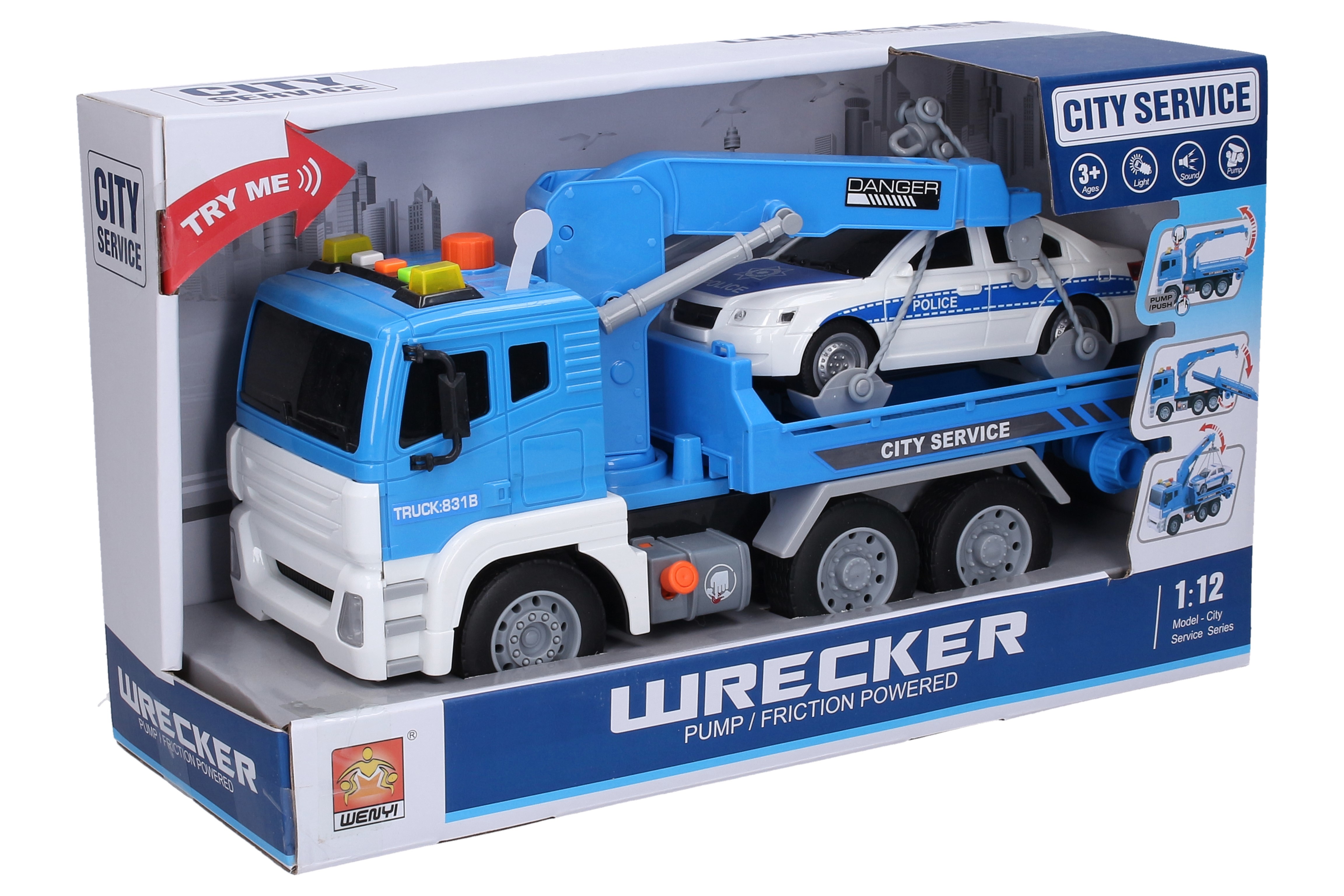 Tahač s autem a efekty. Rozměry 30x13x17 cm. Na setrvačník. Světelné a zvukové efekty tlačítky na kabině tahače. 3xAG13 baterie součástí. Velké oranžové tlačítko na kabině - hydraulika nakládacího ramene - zvedání. Oranžová páčka mezi koly položení (uvolnění) nakládacího ramene. číst celé