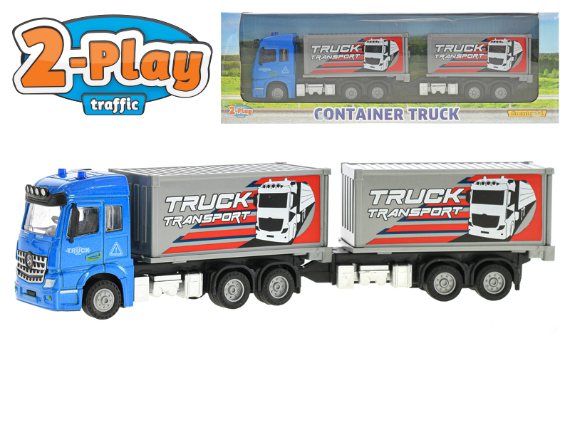 Přepravní auto o velikosti 29cm s přívěsem okouzlí každého malého chlapce. Auto má modrou barvu a na přívěsu má naloženy 2 kontejnery. Tento kovový set je součástí kolekce 2-Play. číst celé