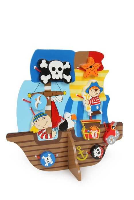 9 barevně lakovaných dřevěných prvků s dobrodružnými motivy lze navlékat na desku v podobě pirátské lodě! Zde děti hravě trénují jemnou motoriku malých prstů.Německá firma Legler zaměřená na výrobu kvalitních dřevěných hraček od roku 1996. Všechny dřevěné hračky značky small foot mají označení CE...