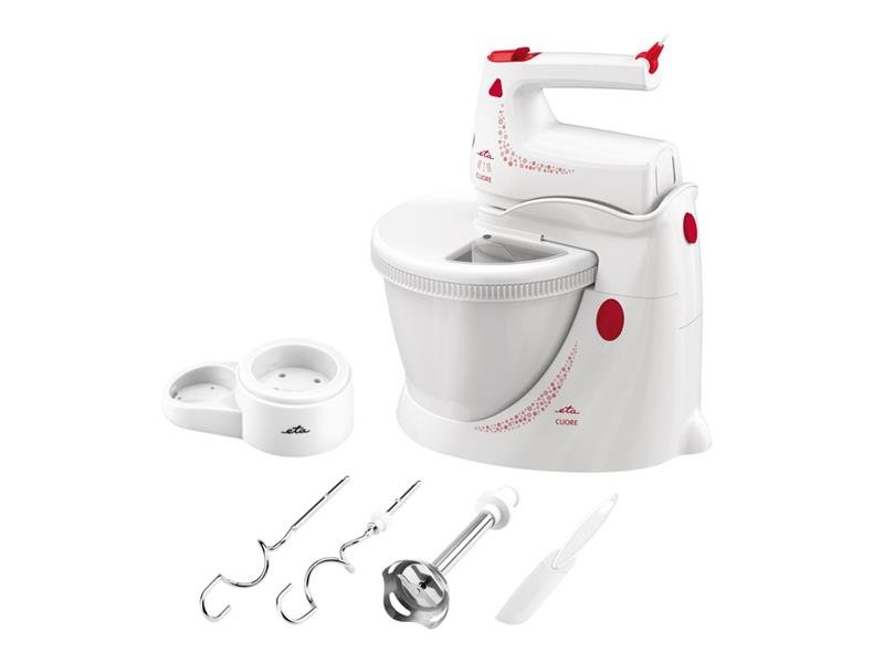 Ruční šlehač Eta 2089 90000 Cuore má ve výbavě stojan s mísou o objemu 3,6 litru, extra dlouhé šlehací metly, 2 hnětací háky, nerezovou mixovací nohu a stojan na příslušenství. Možnost navolení ze 4 rychlostních stupňů a také je přítomno tlačítko Turbo. Šlehač má moderní a elegantní design v bílé barvě s červenými detaily. Ergonomický tvar rukojeti.