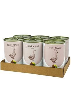 Poctivá konzerva s výjimečně vysokým obsahem husího masa.Konzerva splňuje standard zvaný „double protein“, což znamená, že obsahuje 2 druhy bílkovin – husí a slepičí maso z plemen Ross a Cobb. Dále je v jejím složení už jen zeleninový vývar a za studena lisovaný lněný olej.Přednosti konzerv...