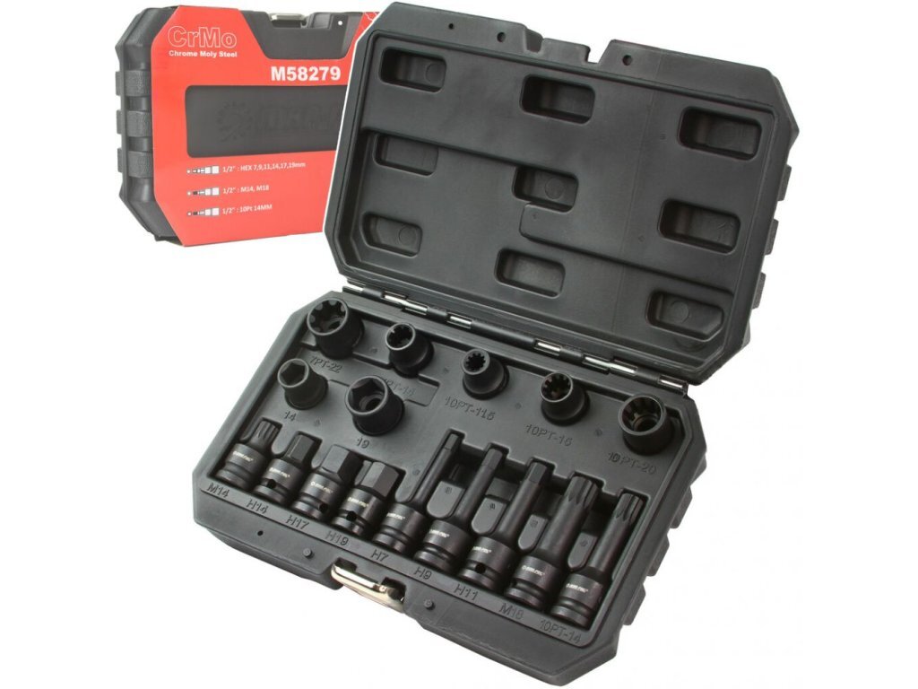 Sada hlavic na brzdové třmeny 1/2", 16ks MAR-POLSada hlavic 1/2" na brzdové třmeny. Nástrčné a zástrčné hlavice v sadě 16 ks.Parametry:materiál: CrMoúchyt: 1/2" kufrObsah sady:  2 ks hlavice nástrčná 1/2" (5 hran - délka 38 mm): 14 mm / 19 mm2 ks hlavice nástrčná 1/2" 7PT (7 drážek - délka 38... číst celé