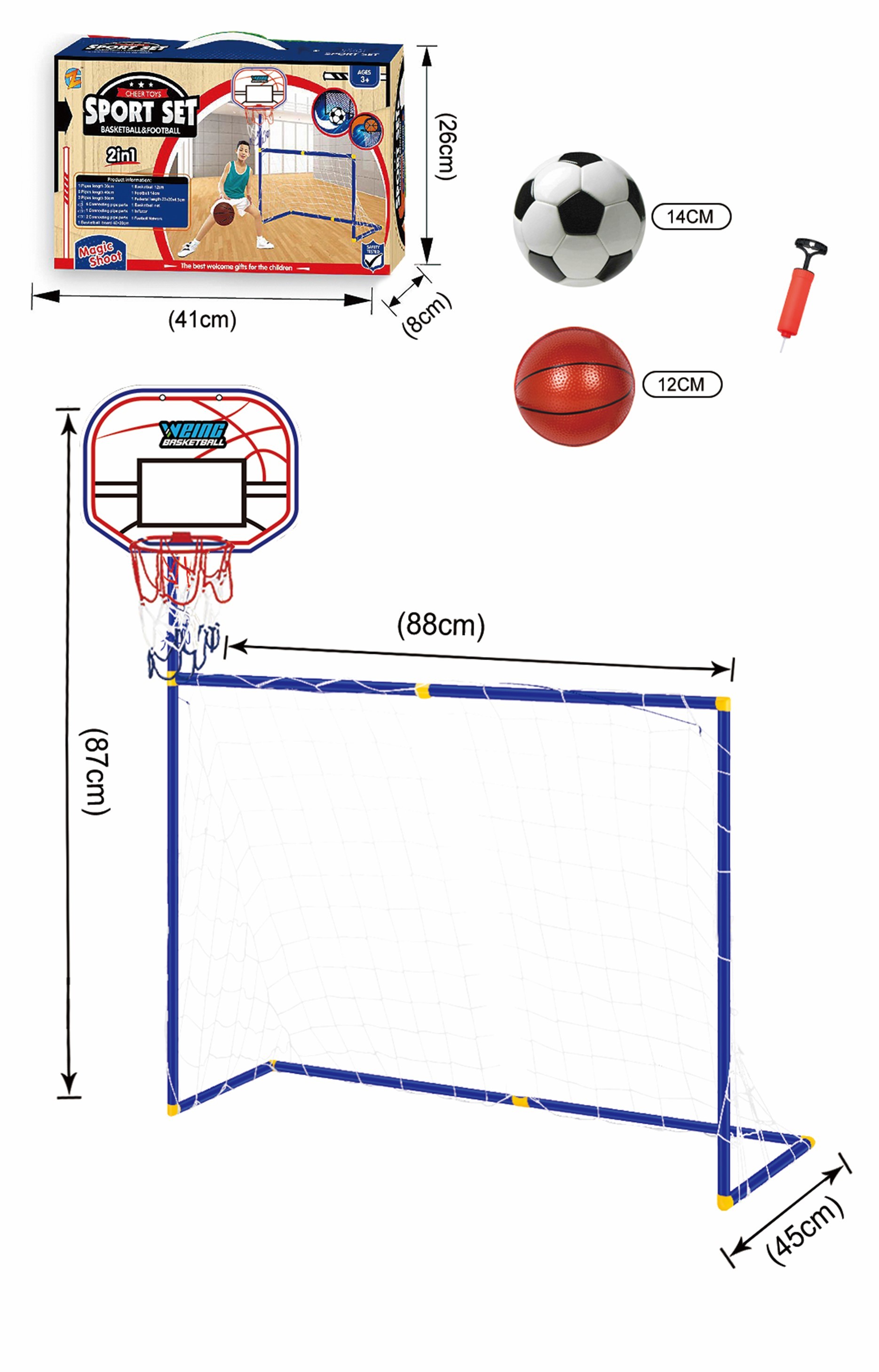 Fotbal nebo basketbal? Sada, která obsahuje náčiní pro obě hry. Vyber si, co si chceš zahrát. Rozměr branky 55x88xx45 cm, výška koše 87 cm, průměr míče na fotbal 14 cm a průměr míče na basketbal 12 cm. V sadě je pumpička na nafouknutí míčků. číst celé