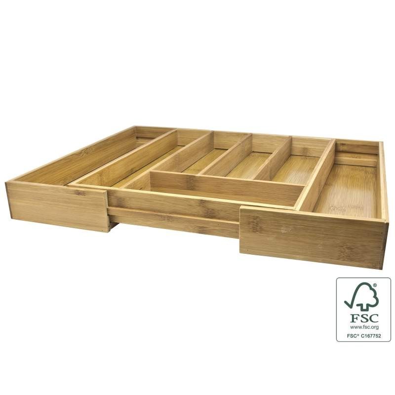 Jeho přesné rozměry zaručují snadnou instalaci do většiny standardních zásuvek. Spodní část je vyrobena z MDF s bambusovým dřevem, což zvyšuje pevnost a stabilitu výrobku. Díky sedmi přihrádkám ve vysunutém stavu máte příbory přehledně uspořádané a vždy po ruce.