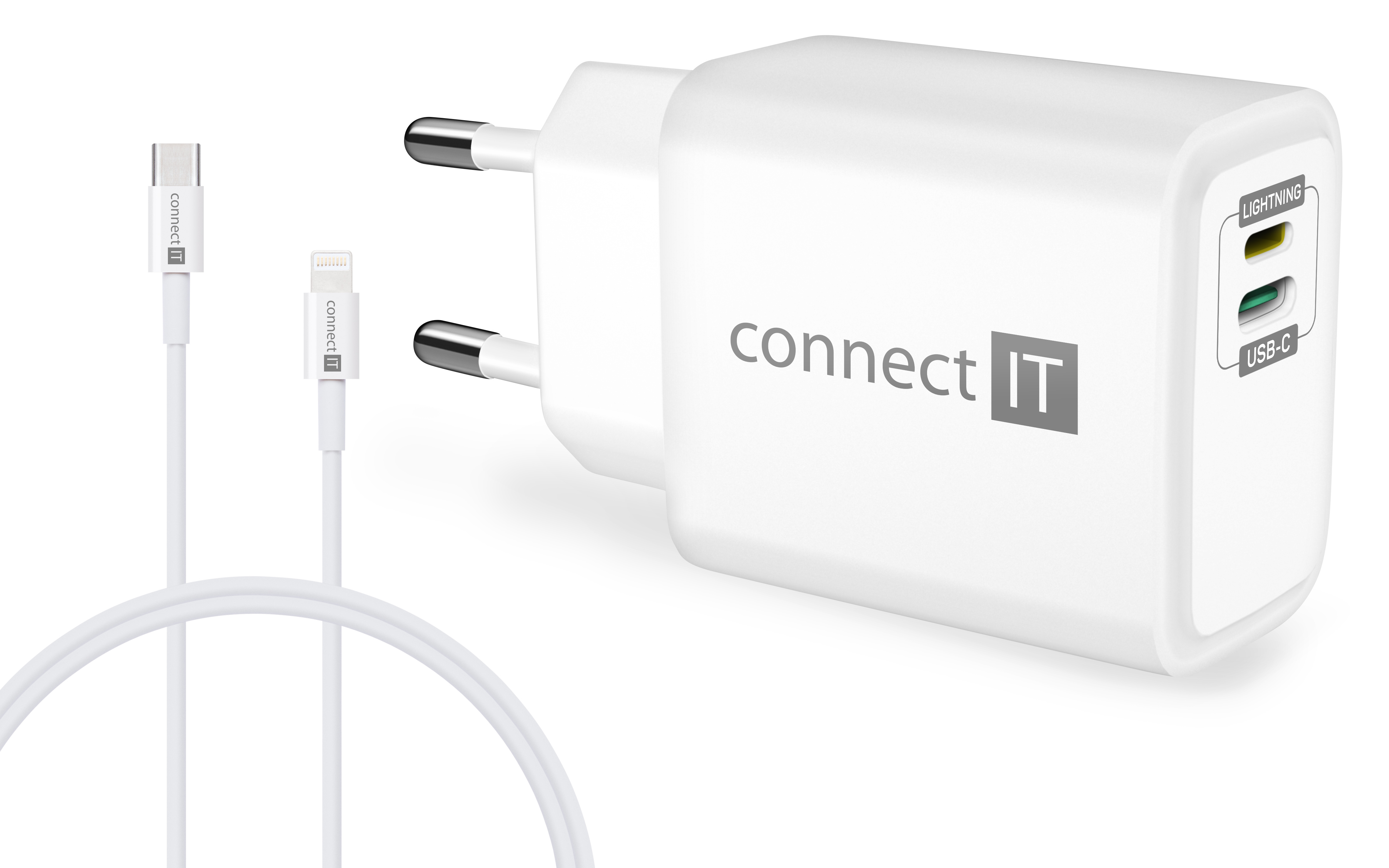 CONNECT IT DUPLEX Nabíjecí adaptér 1xLightning + 1×USB-C, 20W, kabel 27W, BÍLÝ