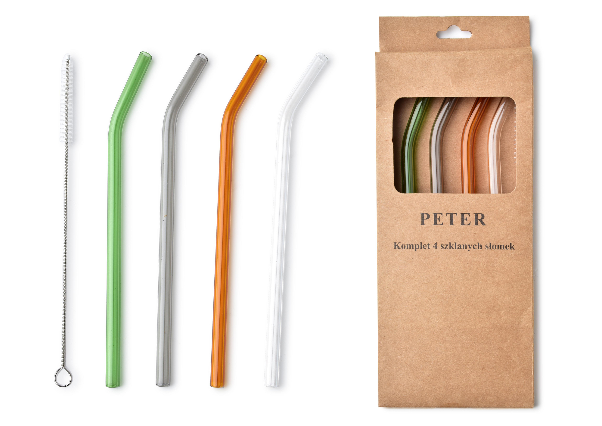 PETER Komplet 4 szklanych słomek w różnych kolorach zapakowanych w eco box.Szklane kolorowe słomki do napojów ze szczoteczką Zestaw składający się z sześciu szklanych słomek do napojów. Eleganckie, wielokrotnego użytku, super komplet do drinków i napojów.W komplecie znajduje się szczoteczka do...