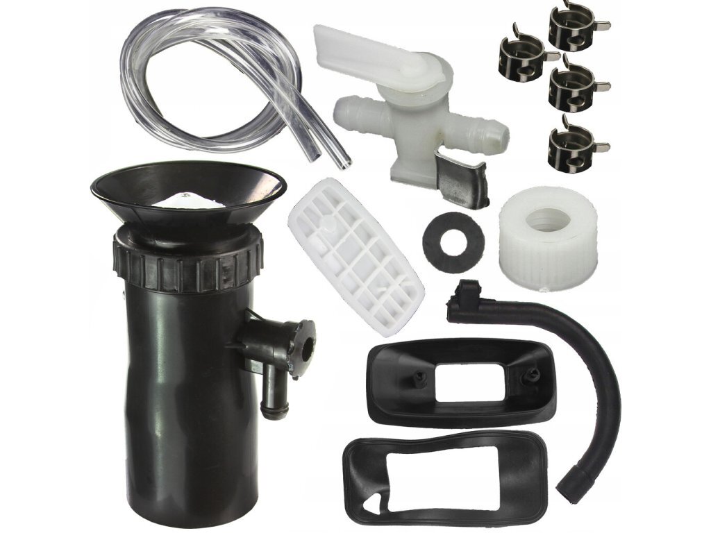 Náhradní díly určené pro motorové postřikovače. Balení obsahuje nádrž, objímky, hadičky, ventil a další.