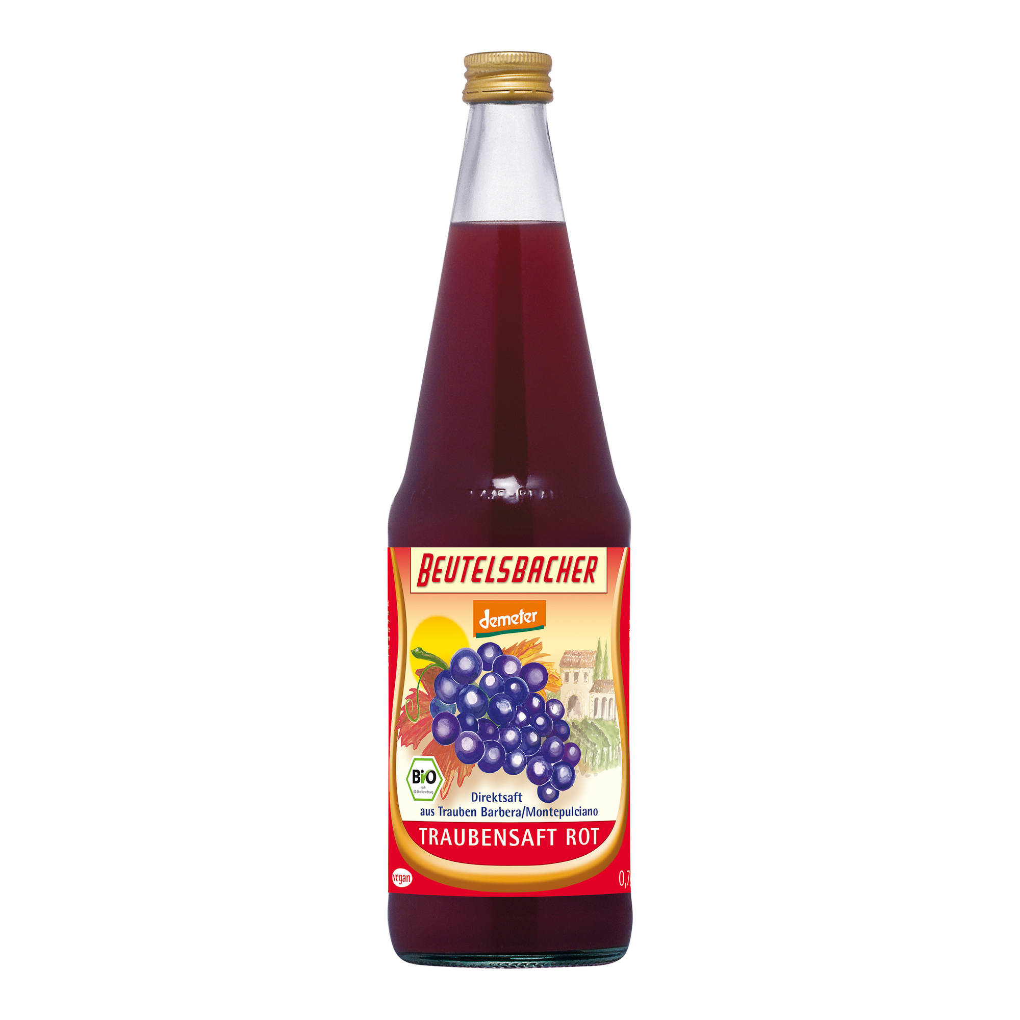 Lisovaná šťáva z červených hroznů. Podíl ovocné složky 100 %. produkt kontrolovaného ekologického zemědělstvíKalorická hodnota/energie (na 100ml):310kJ/74kcal. Tuky: 0,01 g. z toho nasycené mastné kyseliny: 0 g. Sacharidy: 17,8 g. z toho cukry: 17,8 g. Bílkoviny: 0,2 g. Sůl: 0,01 g. Vlákniny: 0...