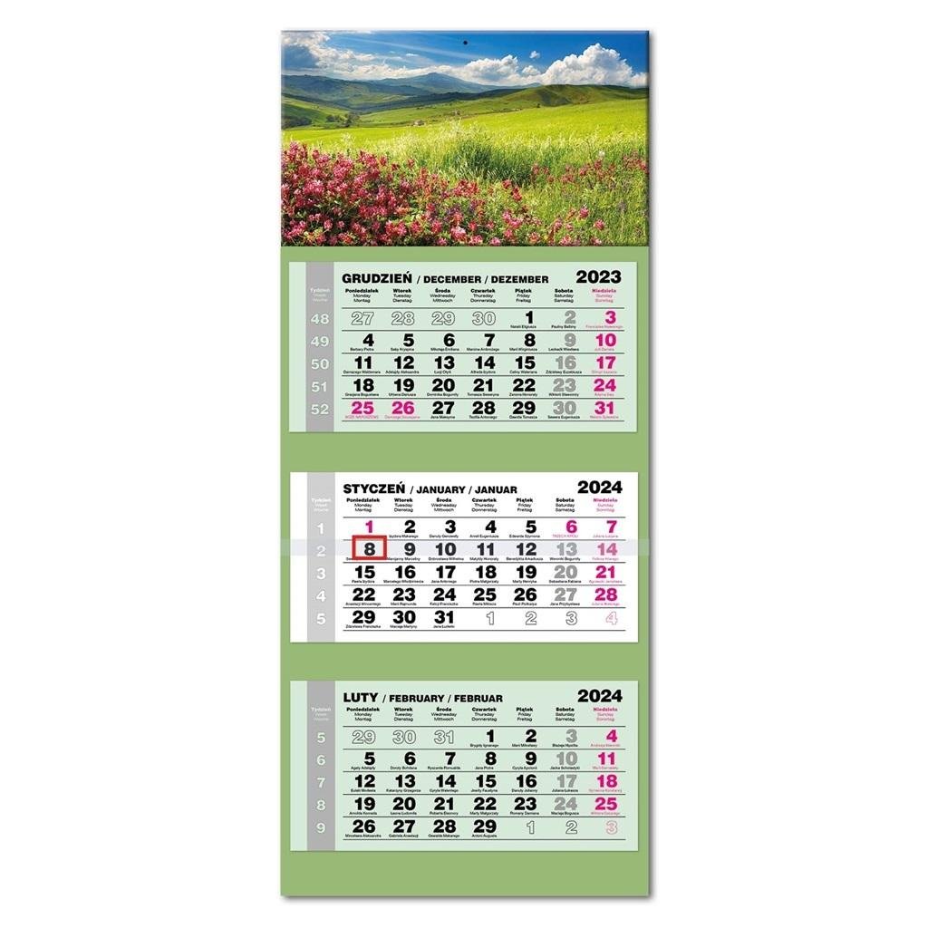 Kalendarz ścienny, trójdzielny LUX.Kalendarz ścienny, trójdzielny z główką wypukłą.Wymiary: 33,5 x 76,5 cm.Układ miesięczny z poprzednim i następnym miesiącem.Posiada numerację tygodni, imieniny.Nazwy miesięcy i dni tygodnia w języku polskim, angielskim, niemieckim.Kalendaria w różnych kolorach... číst celé