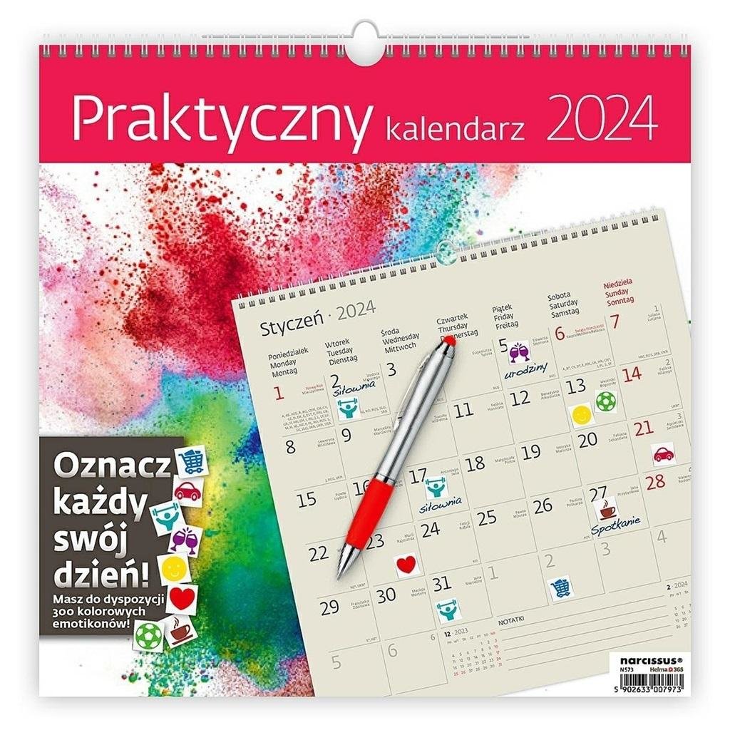 Kalendarz ścienny praktyczny na 2024 rok, z naklejkami ułatwiającymi organizację zajęć i planów. Naklejek jest aż 300 i są one na ostatniej, dodatkowej karcie kalendarza. Tematów oznaczeń jest bardzo dużo: imieniny, urodziny, randka, wakacje, zakupy, dentysta, lekarz, piłka nożna, siłownia,...