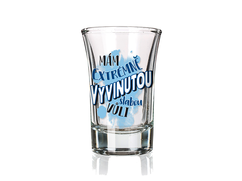 Vtipný panák s textem "Mám extrémně vyvinutou slabou vůli".Objem: 40 mlRozměr: 4,5 x 7 cmMateriál: skloSklenička je vhodná do myčky. číst celé
