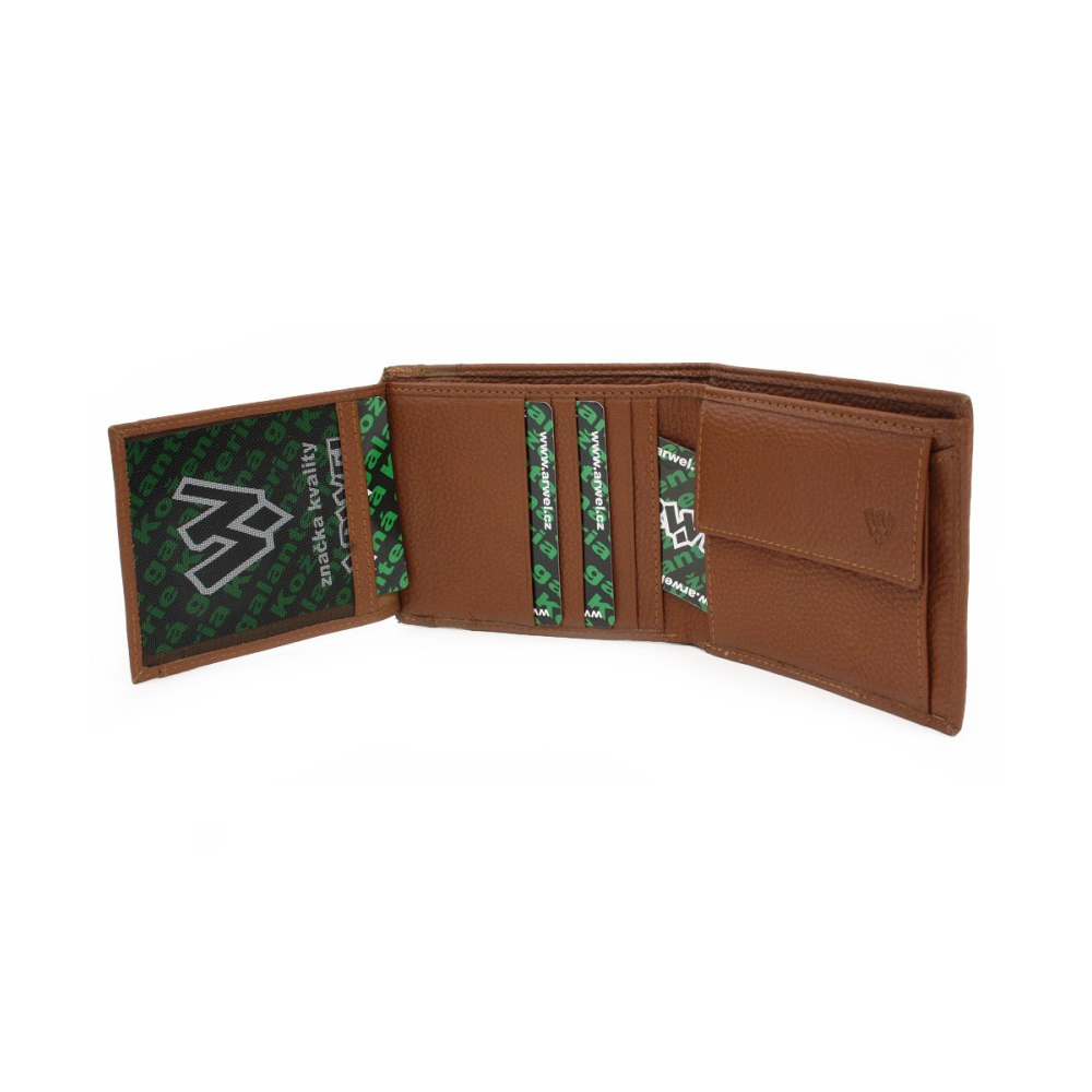 Kožená pánská peněženka od české značky Arwel.Vlastnosti:• 2 přihrádky na bankovky• 1 klopnová kapsa na mince• 10 kapes na kreditní karty, občanský nebo řidičský průkaz• 2 skryté kapsy• 1 průhledné okno• dodávané v ozdobném sáčku a dárkové krabičceMateriál: pravá hovězí kůže (NDM) číst celé