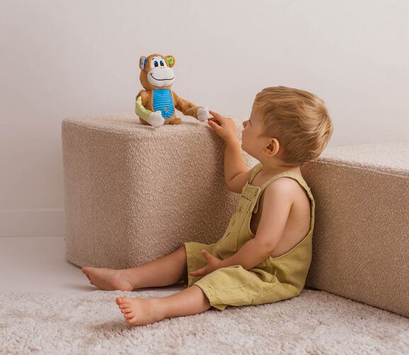 Fikająca małpka zachęcająca dziecko do aktywności Zabawa rozwijająca motorykę i koordynację Hej, szkrabie, zabawny małpiszon porusza się do przodu na swoich obrotowych ramionach, zachęcając dziecko do aktywności fizycznej. Maluch może obserwować ruchy małpki, próbować ją złapać i podążać za nią, co wspiera rozwój motoryki dużej oraz koordynacji ręka-oko. Interaktywne działanie małpki angażuje dziecko do samodzielnego ruchu, rozwijając jego refleks i zdolności ruchowe. Takie ćwiczenia są istotne w rozwoju malucha, uczą przewidywania efektów swoich działań i wzmacniają pewność siebie w aktywnej zabawie. Obrotowe ramiona stymulujące zmysły dotyku Fikająca małpka posiada obrotowe ramiona wykonane z materiałów o zróżnicowanych fakturach. Dotykanie ich podczas zabawy stymuluje zmysł dotyku dziecka, ucząc odróżniania miękkich, twardych i wypukłych powierzchni. Maluch uczy się precyzyjnych ruchów, wciskając i przesuwając elementy małpki, co wspiera rozwój motoryki małej. Różnorodność faktur pobudza ciekawość i zachęca do eksperymentowania, a dynamiczne ruchy zabawki dodają zabawie atrakcyjności i radości. Wesołe melodie dla uatrakcyjnienia zabawy Podczas poruszania się fikającej małpki dziecko słyszy dwie wesołe melodie, które uprzyjemniają zabawę i angażują słuch malucha. Dźwięki motywują dziecko do podążania za zabawką i powtarzania działań, rozwijając percepcję słuchową oraz koncentrację. Interakcja z małpką staje się wielozmysłowa – dziecko obserwuje ruch, dotyka zróżnicowanych elementów i słucha melodyjnych dźwięków, co wspiera wszechstronny rozwój poznawczy i sensoryczny w przyjemny i angażujący sposób. Edukacyjna fikająca małpka dla dzieci od 18 miesiąca życia Rozwój zdolności manualnych i ruchowych Fikająca małpka wspiera rozwój zdolności manualnych i ruchowych dziecka poprzez obserwację i manipulację elementami zabawki. Obracające się ramiona oraz ruch w przód zachęcają malucha do aktywnego podążania za małpką, rozwijając koordynację ruchową oraz refleks. Dziecko uczy się planować ruchy, przewidywać efekty działań i kontrolować siłę używaną do manipulowania elementami, co wspiera rozwój motoryki małej i dużej, a także wzmacnia pewność siebie podczas samodzielnej zabawy. Zróżnicowane faktury stymulujące zmysł dotyku Małpka została wykonana z materiałów o różnorodnych fakturach, co pobudza zmysł dotyku dziecka. Maluch poznaje różne powierzchnie, przesuwając dłonie po ramionach i ciele zabawki, co rozwija percepcję dotykową i precyzję ruchów. Zróżnicowane faktury dodatkowo angażują ciekawość dziecka, zachęcając do dalszej interakcji i eksperymentowania z zabawką. Takie doświadczenia wspierają rozwój sensoryczny, zdolności poznawcze oraz manualne, jednocześnie zapewniając radosną i angażującą zabawę. Melodie wspierające rozwój zmysłu słuchu Dwie wesołe melodie towarzyszące ruchowi małpki angażują zmysł słuchu dziecka i wspierają jego rozwój językowy oraz percepcję dźwięków. Dźwięki przyciągają uwagę malucha, motywując go do podążania za małpką i powtarzania czynności. Interaktywne połączenie ruchu, dotyku i dźwięku sprawia, że zabawa staje się wielozmysłowa i edukacyjna. Dzięki temu dziecko rozwija koncentrację, spostrzegawczość oraz koordynację ruchową w sposób przyjemny, naturalny i w pełni angażujący. Interaktywna fikająca małpka stymulująca rozwój dziecka Bezpieczna zabawka dla dzieci od 18 miesiąca życia Fikająca małpka została zaprojektowana z myślą o bezpieczeństwie dzieci od 18 miesiąca życia. Wszystkie elementy są wykonane z trwałych materiałów, a ich kształty i faktury zapewniają komfortową i bezpieczną zabawę. Dziecko może podążać za małpką, manipulować jej ramionami oraz słuchać melodii bez ryzyka urazów. Stabilna konstrukcja oraz wytrzymałe elementy gwarantują wielokrotne użycie, pozwalając maluchowi na rozwój motoryki, zmysłów i zdolności poznawczych w bezpieczny i przyjazny sposób. Zabawa łącząca ruch i interaktywne elementy Obrotowe ramiona, ruch do przodu oraz wesołe melodie sprawiają, że fikająca małpka angażuje dziecko w interaktywną zabawę. Maluch może śledzić ruch, dotykać elementów i reagować na dźwięki, co rozwija koordynację ruchową, refleks oraz zdolności poznawcze. Zabawa z małpką staje się atrakcyjna i wielozmysłowa, pozwalając dziecku jednocześnie rozwijać zdolności manualne i sensoryczne. Takie doświadczenia wspierają wszechstronny rozwój w sposób naturalny i przyjemny. Radosne doświadczenie edukacyjne dla malucha Fikająca małpka zapewnia dziecku radosne i edukacyjne doświadczenie, łącząc ruch, dotyk i dźwięk. Maluch uczy się koordynacji, koncentracji i percepcji zmysłowej poprzez interakcję z zabawką. Obserwacja ruchu, eksperymentowanie z ramionami oraz słuchanie melodii rozwijają kreatywność i zdolności poznawcze. Takie angażujące doświadczenie pozwala dziecku czerpać satysfakcję z samodzielnej zabawy, jednocześnie wspierając wszechstronny rozwój fizyczny i umysłowy w bezpieczny i przyjemny sposób.