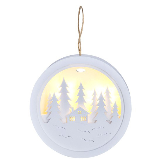 Interiérová bateriová kruhová vánoční LED dekorace o průměru 14 cm s obrázkem zasněžených stromů a chaty je podsvícena 4 integrovanými LED diodami s příjemným teplým bílým svitem pro navození pohodové vánoční atmosféry. Pro výrobu bylo použito přírodní dřevo v kombinaci s plastem v bílém...