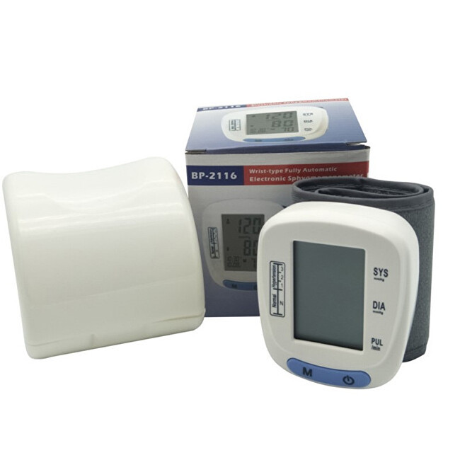 Zápěstní digitální tlakoměr určen pro přesné měření systolického i diastolického krevního tlaku a tepové frekvence. Plně automatický profesionální tlakoměr měří oscilometrickou metodou s rozsahem měření tlaku 0 mmHg 300 mmHg a tepu 30–180 úderů/minutu s přesností ±3 mmHg (tlak) a ± 5 % tep. LCD...