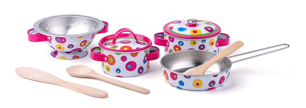 Kuchyňský set s trendy dekorem obsahuje plechové kuchyňské nádobí a dřevěné náčiní. Sada obsahuje 9 ks.| Věk: 3+| Průměr hrnce: 9,5 cm číst celé