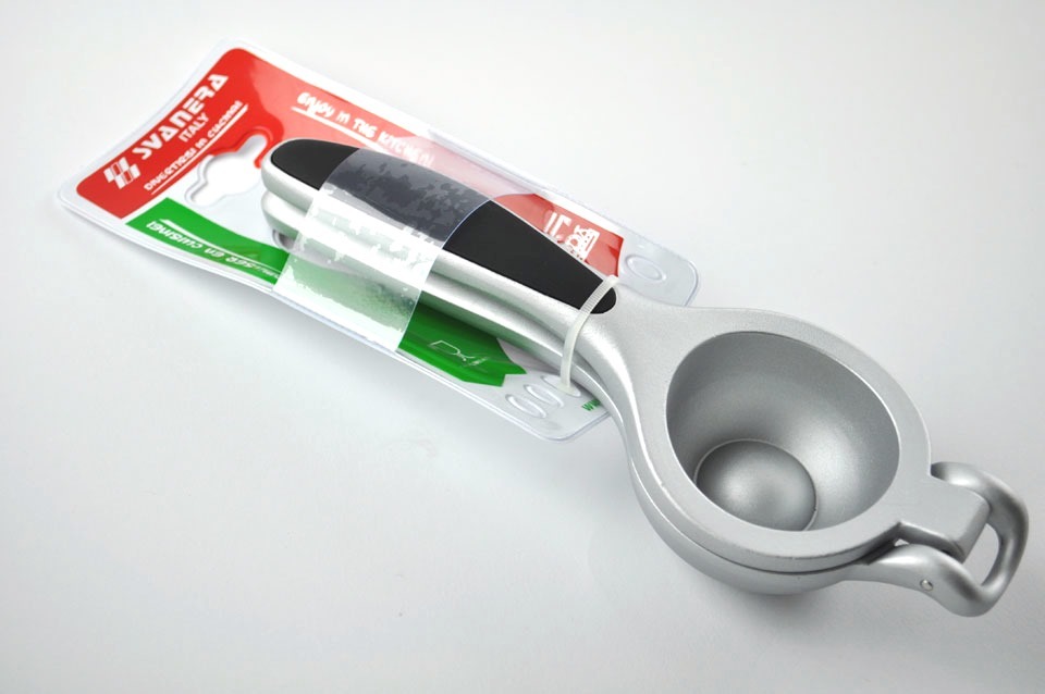 kvalitní pevný odšťavňovač na citron v provedení mačkadlo, usnadňuje vylisování šťávy z citronu a jiných menších citrusů, průměr hlavy 7,5 cm, měkčené rukojeti vhodný do myčky nádobí italský výrobce EAN 8005498097350 číst celé