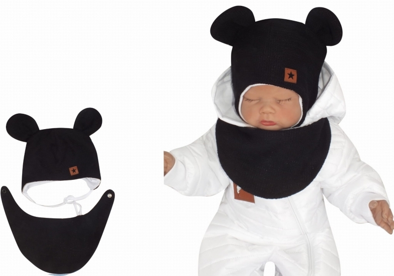 Z&Z Dvouvrstvá pletená čepice na zavazování s šátkem 2v1, Méďa - černá, vel. 68; 68 (3-6m)