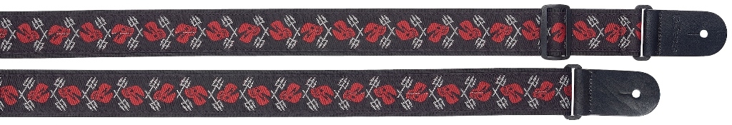 Kytarový popruh z nylonu. Má kožené konce s gravírovaným logem. Je zdobený vzorem lebek s trojzubci po celé svojí délce. Nastavitelná délka: 85-145cm. Šířka: 5,5 cm. Tloušťka: 1,8 cm. Barva: červenáBarva: červenáNastavitelná délka: 85-145cm Šířka: 5,5 cmTloušťka: 1,8 cm číst celé