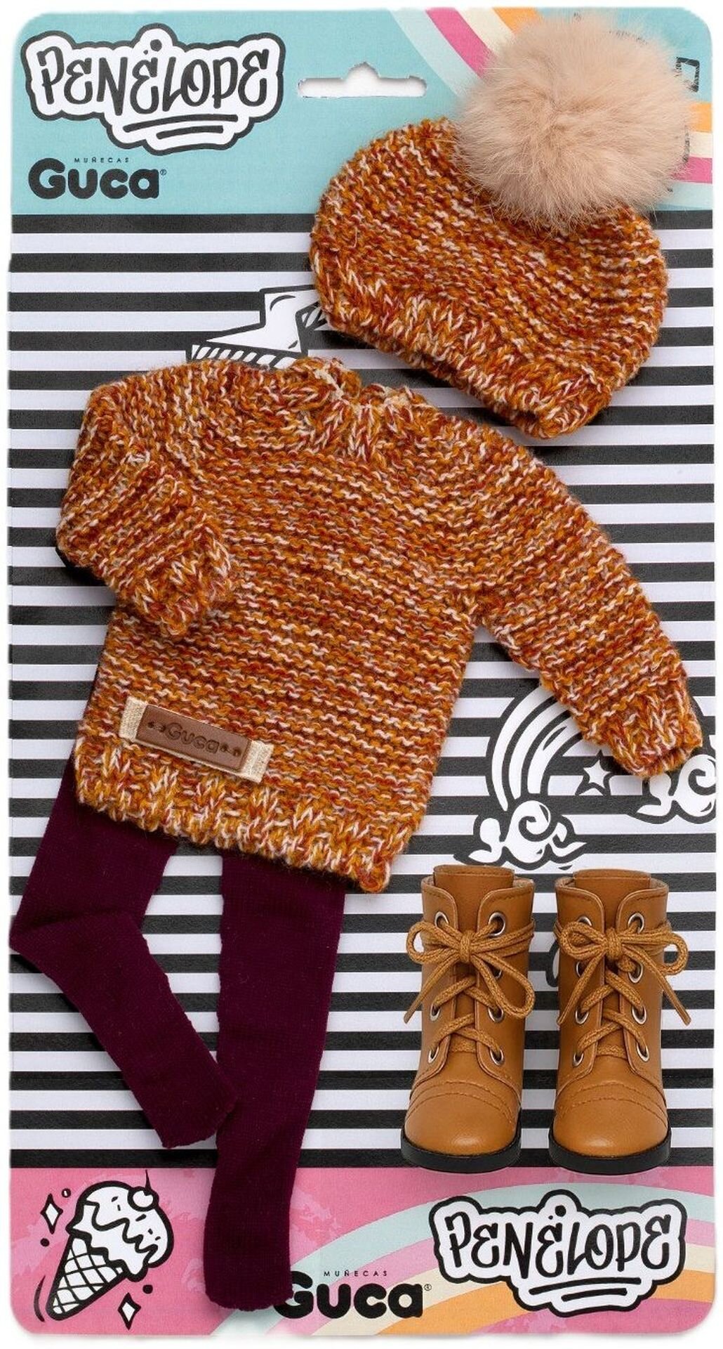 4dílný set: 3 kusy oblečení a botičky pro panenku Penelope velikosti 34 cm. Vyrobeno ručně ve Španělsku, baleno v igelitovém obalu na kartonové podložce. Doporučený věk od 3 let. číst celé