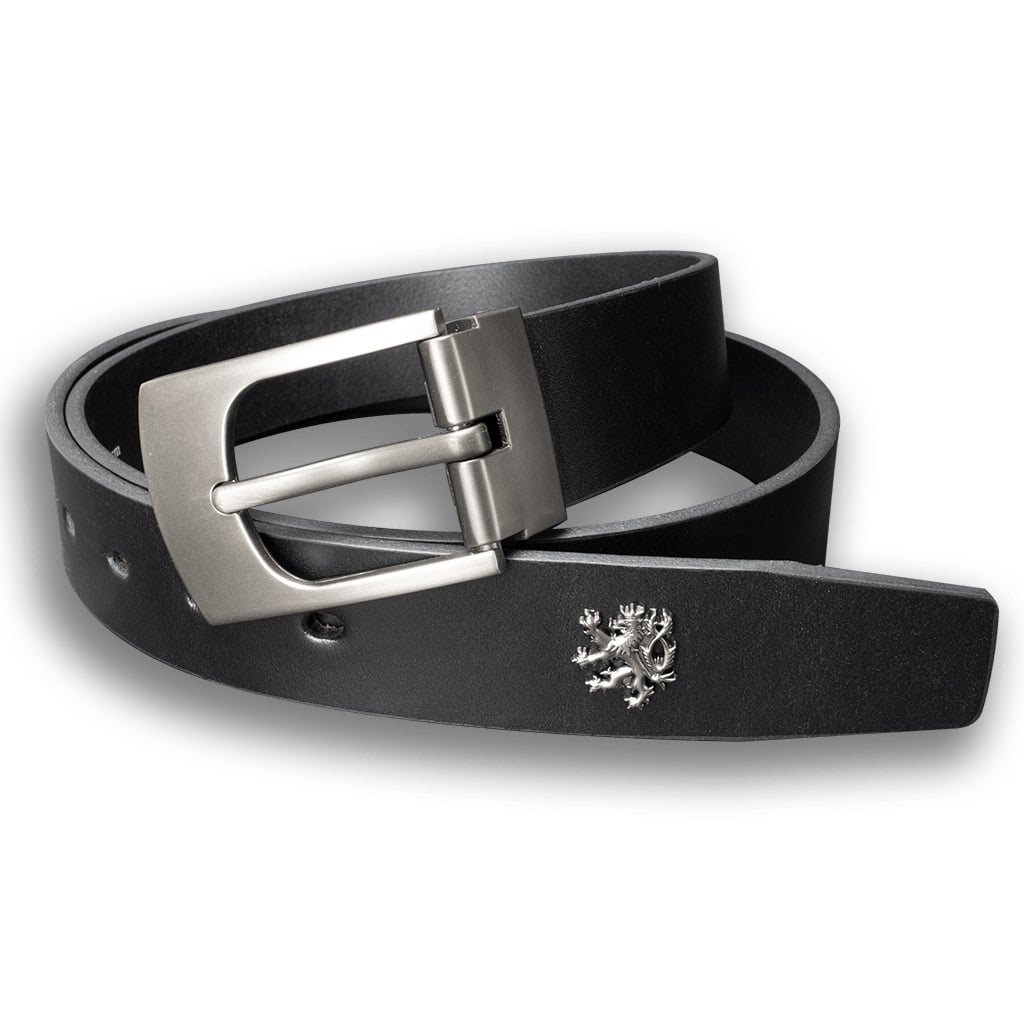 Masivní kovová přezka s trnem klasického stylu. Na kůži je upevněn decentní odznak Českého lva. Tento opasek se skvěle hodí ke společenským kalhotám. Délku koženého opasku lze snadno zkrátit dle potřeby. číst celé
