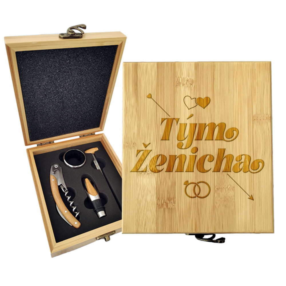 Dárková sada na víno v dřevěné krabičceIdeální dárek pro každého milovníka vína je dřevěná krabička se sadou na víno s originálním gravírovaným věnováním.Sada obsahuje 4 kusy a krabička je vyrobená z bambusu.Rozměry: 147×168×49 mm  číst celé