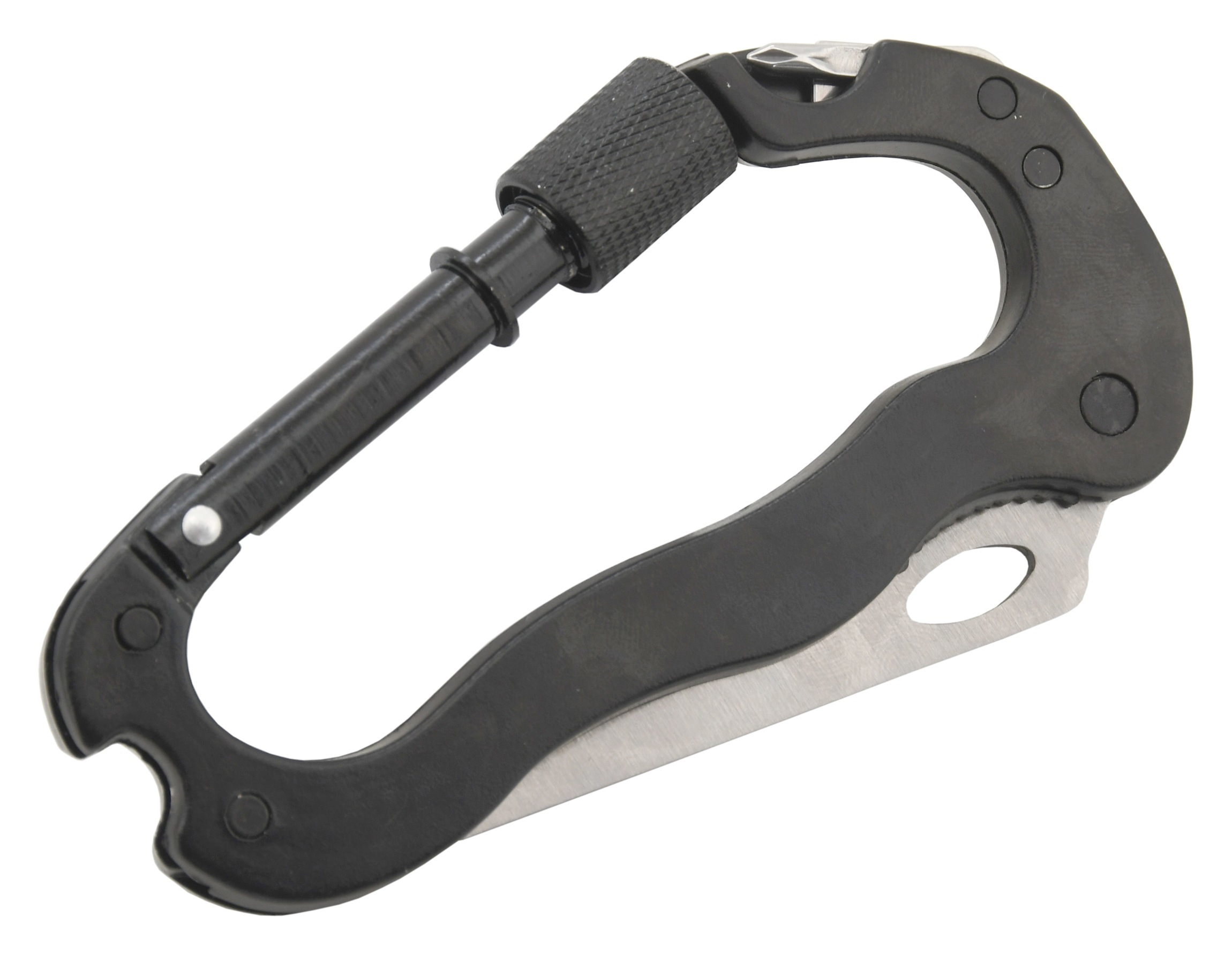 Hliníková multifunkční karabina opatřená šroubovací, převlečnou pojistkou, pro zamezení nechtěného rozepnutí. Rozměry karabiny 116 x 66 mm zajistí bezpečné uchycení veškeré kempingové výbavy. Karabina je opatřena nožem délky 7,5 cm s pilkovou částí, nůž je opatřen pojistkou, takže nehrozí jeho...