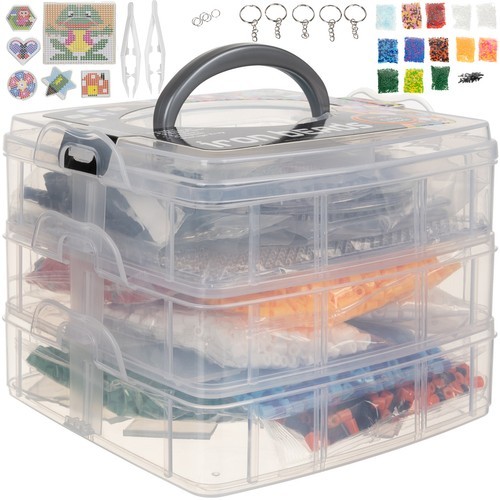 - POUZDRO / ORGANIZÁTOR S DRŽADLEM – celek je zabalen v 3patrovém organizéru, 2 patra mají přihrádky na korálky a ve třetím patře je otevřená přihrádka na příslušenství. Všechna patra jsou uzavřena na západky a organizér má rukojeť pro přenášení.
